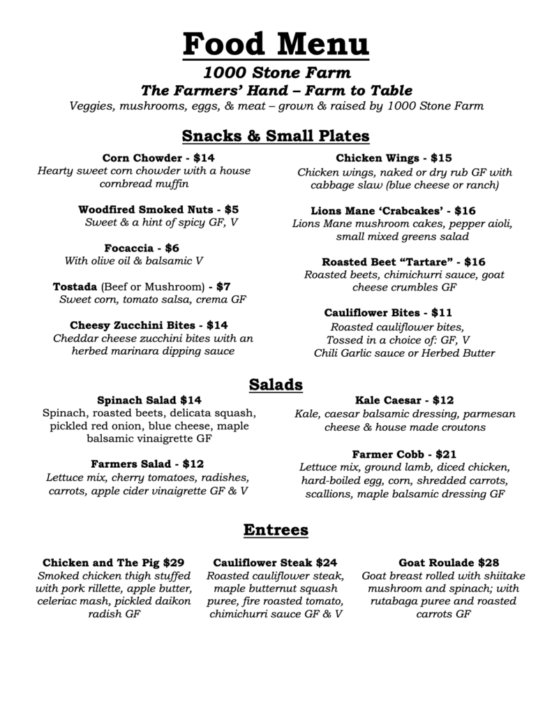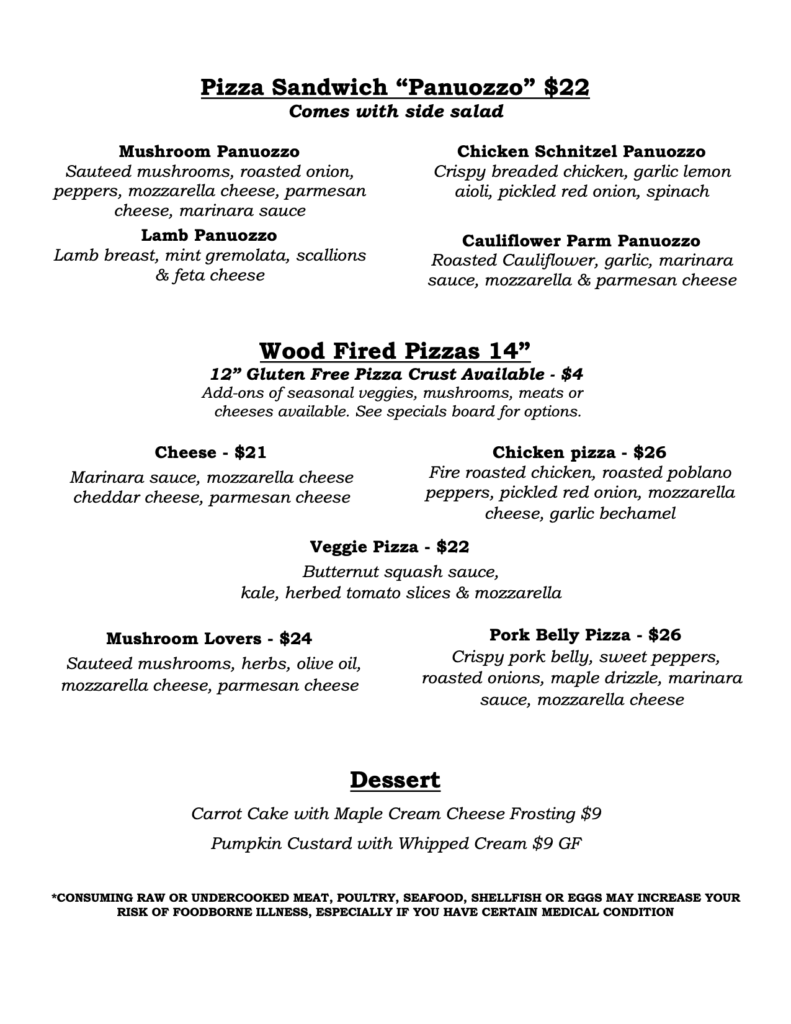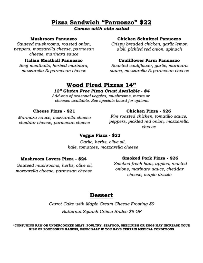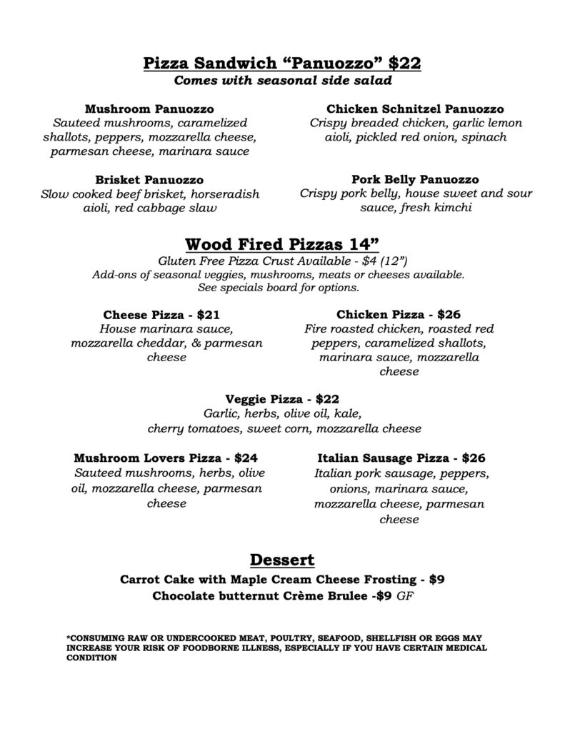 Our Seasonal Menu has a variety of options including but not limited too: salad, soup, wood fired pizza, panuozzo (Italian Sandwich), entrees vegetarian and omnivore, as well as small plates & cheese charcuterie pickle plates.