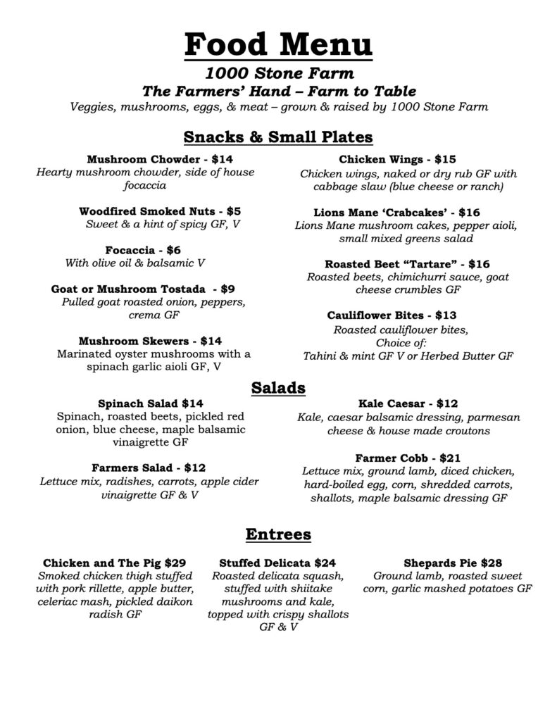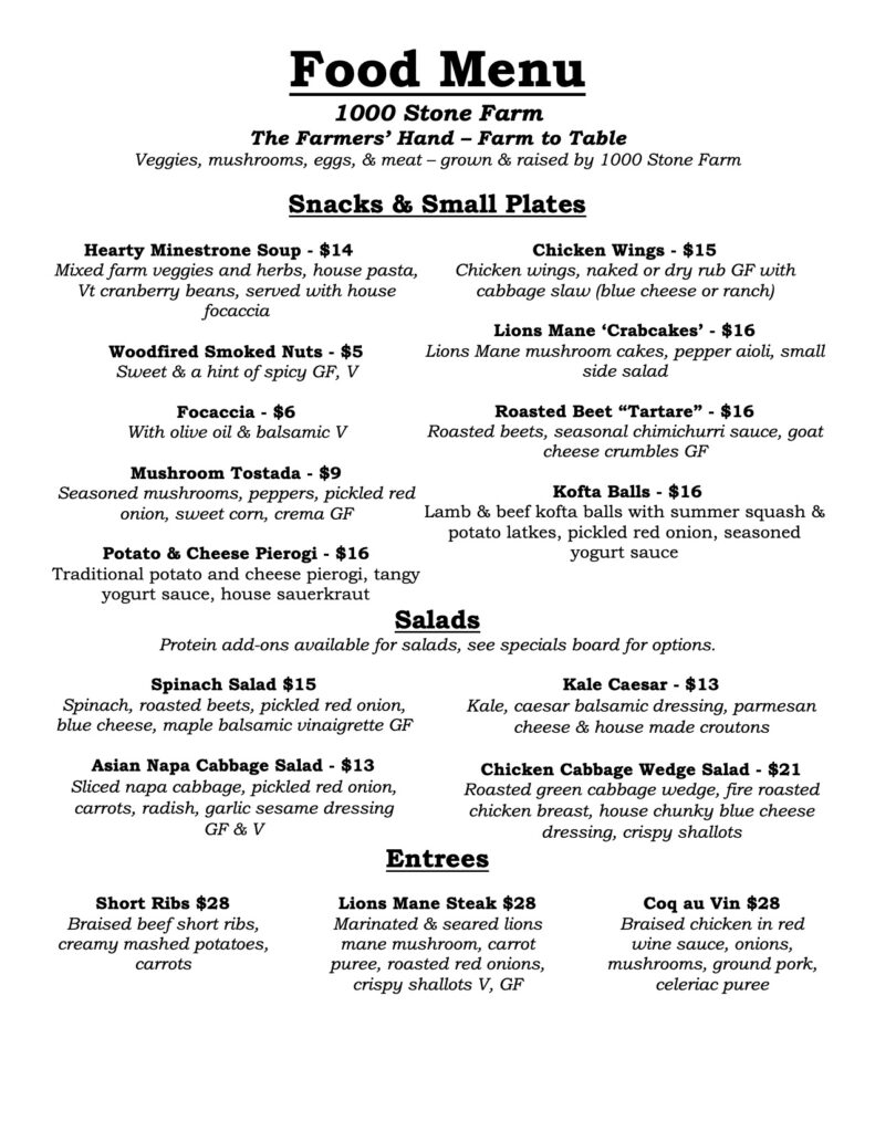 “One of our main goals for this new adventure is to feed the community food that we have grown & raised right here on our farm. All the vegetables and mushrooms are certified organic; all the meat has been raised on pasture. Ingredients that aren’t directly from our own farm are sourced from our fellow Vermont producers. Eat well & Enjoy each other.“